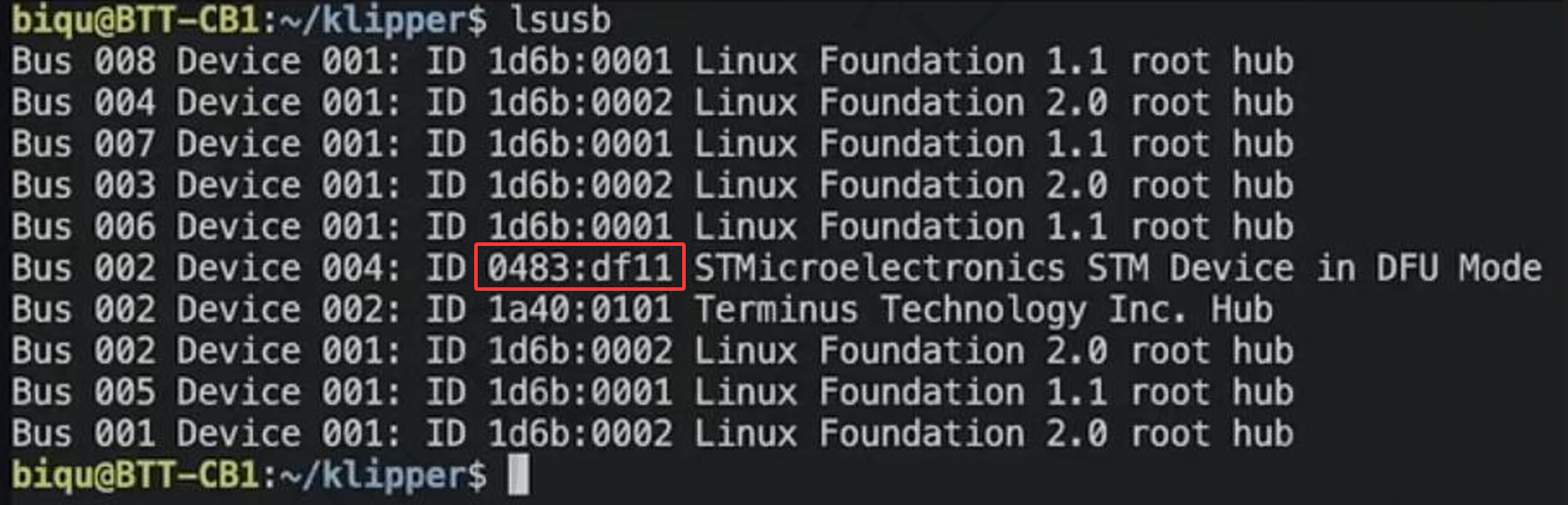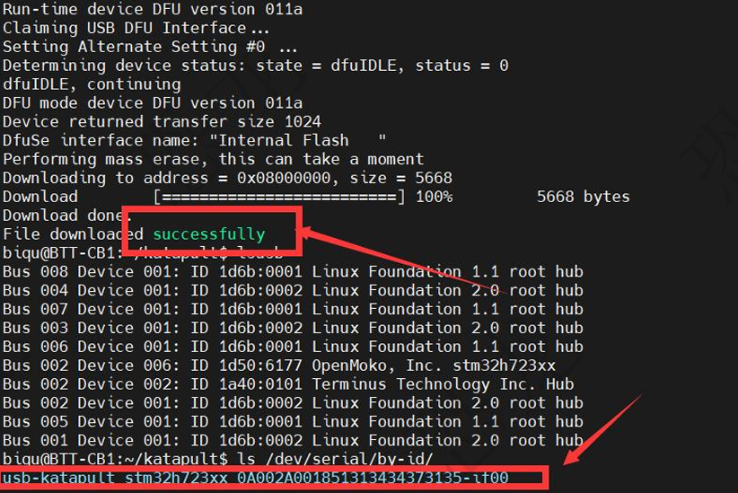 sudo dfu-util -a 0 -D ~/katapult/out/katapult.bin --dfuse-address 0x08000000:force:mass-erase -d 0483:df11刷入成功后,退出dfu并按一下主板上的RESET按键重启主板