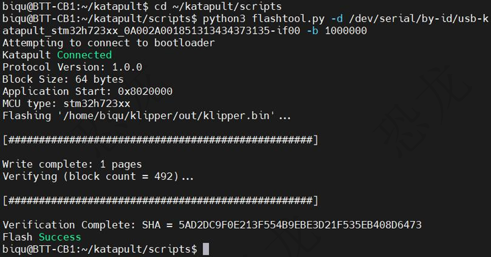 cd ~/katapult/scripts输入下面命令用katapult来刷入klipper固件,替换成查询到的uuid