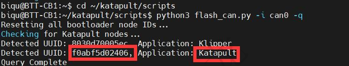 cd~/katapult/scripts查询 Can0 通道下设备的 UUID 用于烧录: