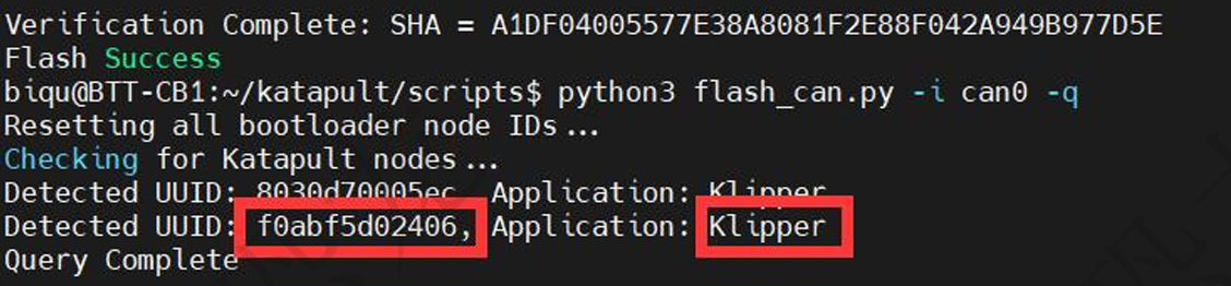 python3 flash_can.py -i can0 -f ~/klipper/out/klipper.bin -u 9fa13b428e5b等待烧录完成后,执行查询命令验证固件状态: